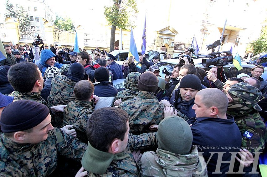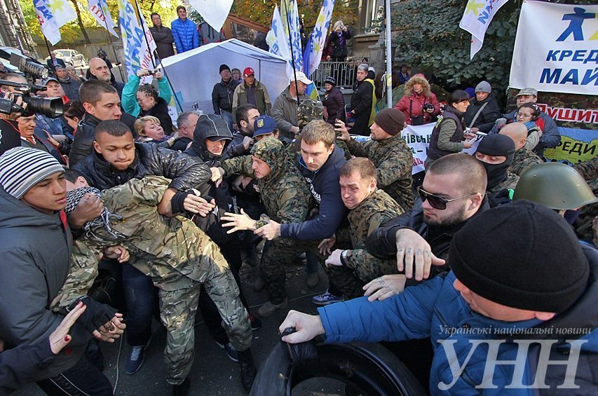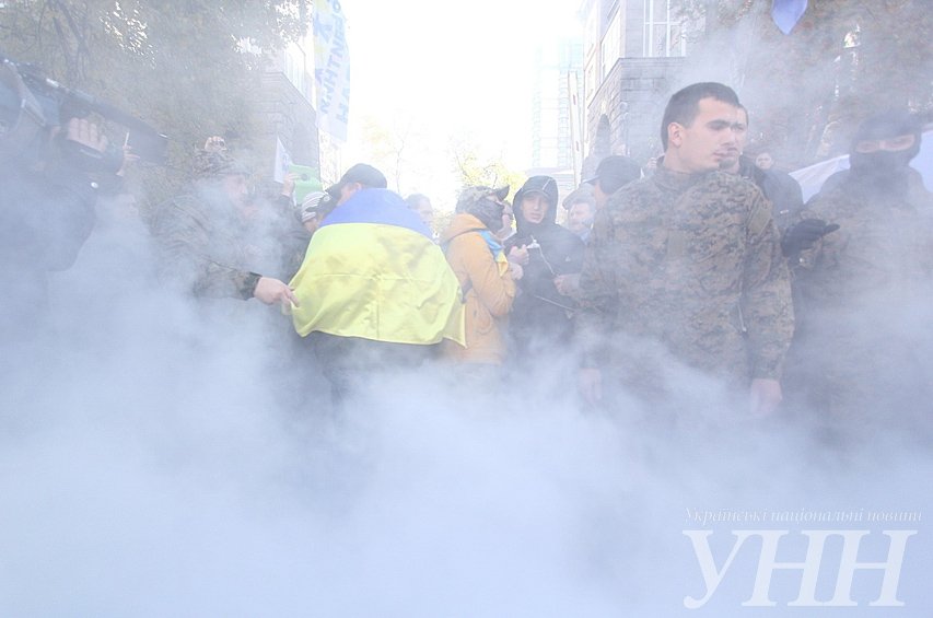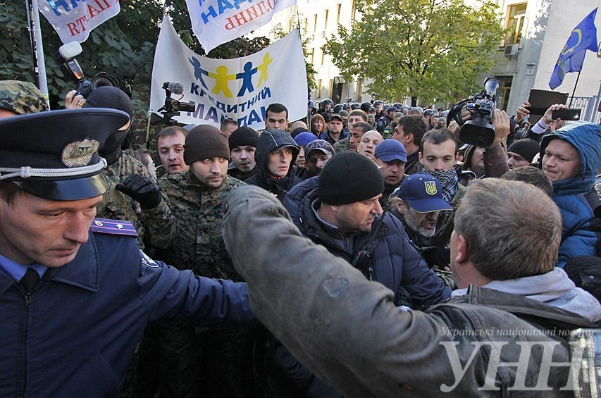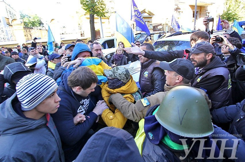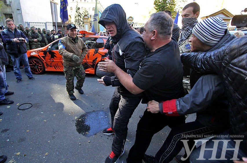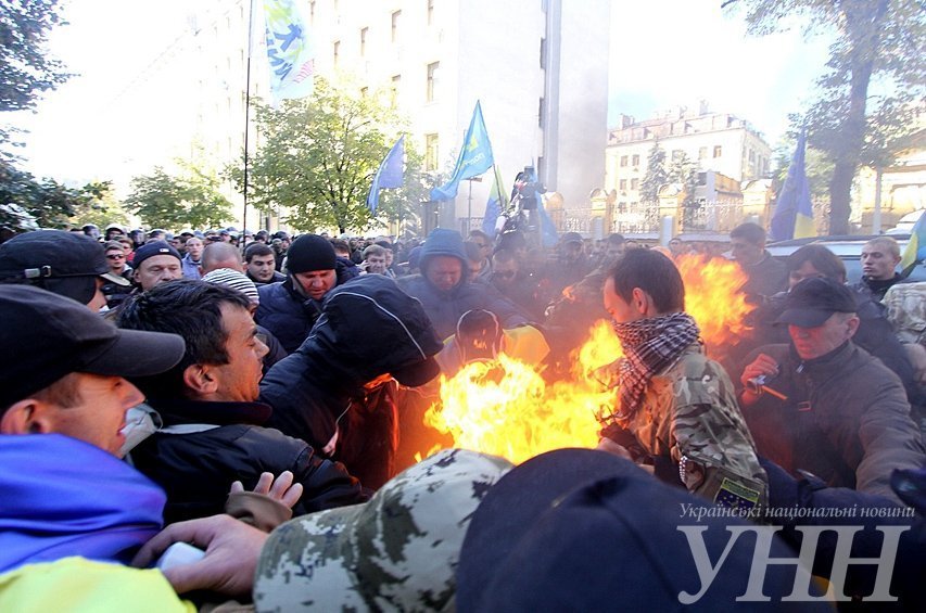 Активісти піднесли до кордону з правоохоронцями, які охороняли будівлю АП, одну із покришок та облили її бензином, після чого на активістів накинулися невідомі у камуфляжному одязі, без шевронів та розпізнавальних знаків.