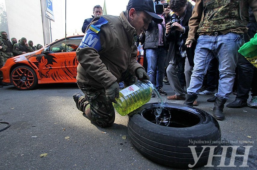 Пізніше активісти рушили автоколоною до будинку Глави держави, де підпалили автомобільну покришку.