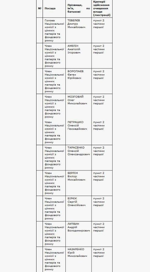 Також оприлюднено список керівних працівників центральних органів виконавчої влади, які підлягають звільненню із займаних посад згідно із законом «Про очищення влади», але звільнених за власним бажанням згідно з поданими до набрання чинності закону заявами.