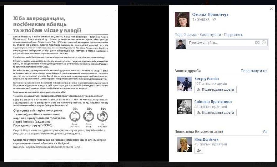 17 жовтня у селі Новосілки Горохівського району представники штабу кандидата на відео відзняли людину, яка представилась добровольцем батальйону, що воює на сході і мала при собі таку листівку.