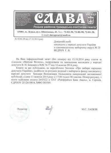 Прес-секретар кандидата Оксана Прокопчук у соціальній мережі Facebook розмістила допис із фото, в якому повідомила, що текст цих листівок та стаття, опублікована у районній газеті, є ідентичними. При цьому вона зазначила, що публікацію у ЗМІ проплатив інший кандидат по 20 округу – Володимир Бондар.