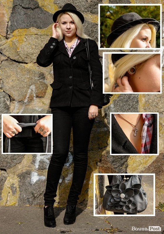 Дане взуття на підборах зорово видовжує ноги і виглядає в гармонії зі штанами. Найстильнішим елементом образу є капелюшок «федора», одягнений по-європейськи. Картата сорочка також вдало компонується з іншими речами.