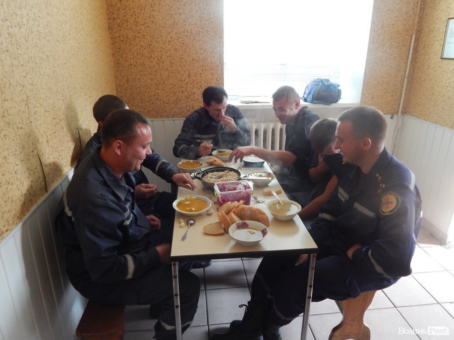 «Кожен із хлопців приносить продукти, або вже приготовані страви. Часто на обід варимо супи, борщі та другі страви. У нашій частині немає ні кухарок, ні прибиральниць, всю роботу виконуємо власними силами. Хоча передбачено забезпечення державою працівників МНС сухпайками та цілим рядом пільг», - заявив рятувальник.
