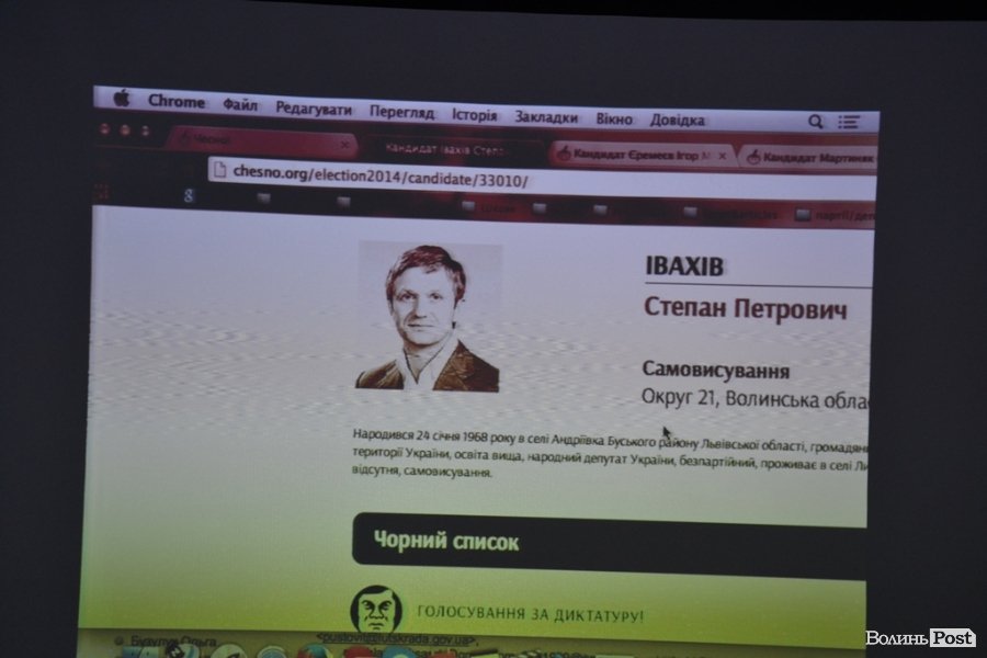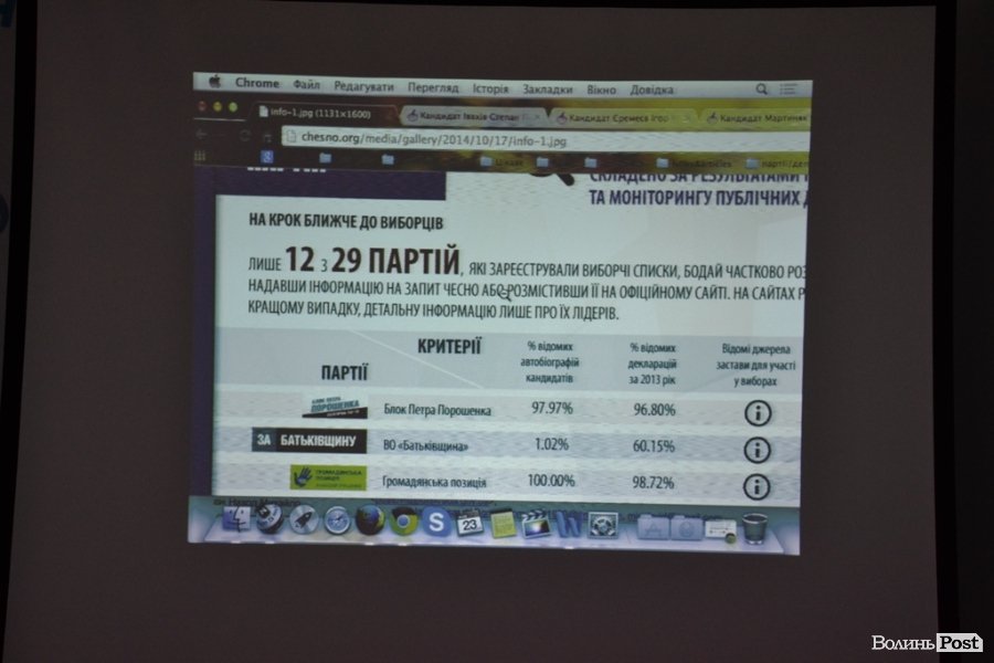 Представник руху «Чесно» на Волині Марія Доманська розповіла, що її організація станом на 16 жовтня провела власні дослідження щодо прозорості передвиборчих перегонів. Пошук інформації відбувався шляхом моніторингу офіційних державних сайтів, політичних партій та через запити.