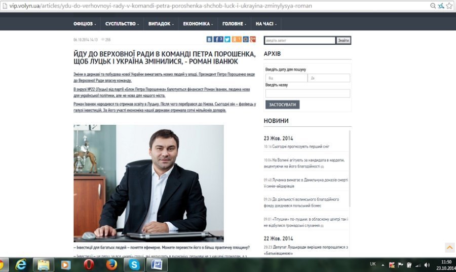 На Волинському інформаційному порталі є інтерв'ю з кандидатом в народні депутати Романом Іванюком без позначки, що це політична реклама. Матеріал починається з заголовку «Йду до Верховної Ради в команді Петра Порошенка, щоб Луцьк і Україна змінилися. Такий матеріал має ознаки «джинси».