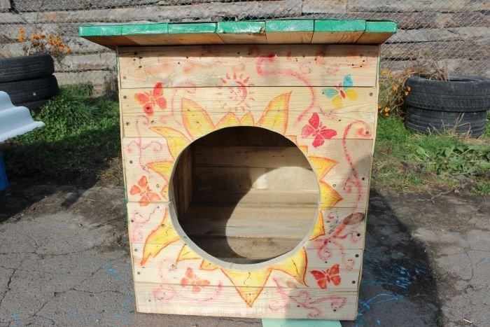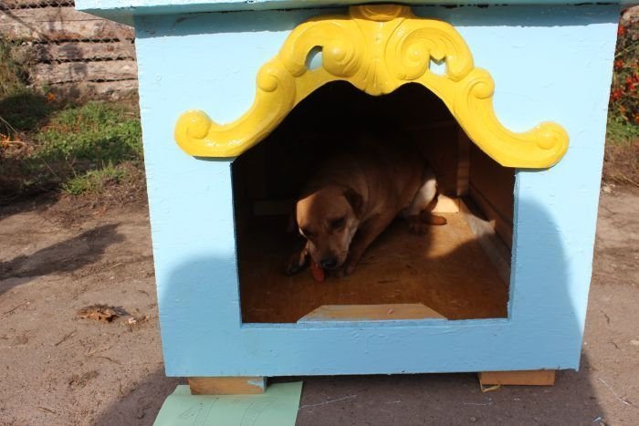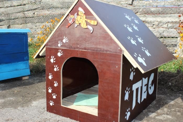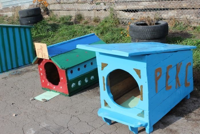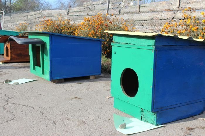 Були тут і будиночки у жовто-блакитних кольорах, іменні будки, вирізьблені узорами, з відбитками лап тварин тощо. Мешканці притулку з цікавістю розглядали нові помешкання, деякі — встигли й вподобати.