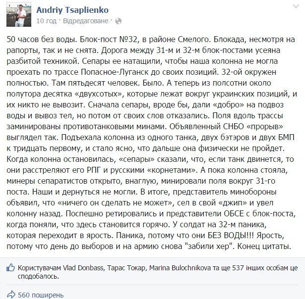 "Дорога між 31-м і 32-м блокпостами всіяна розбитою технікою. Сепари її понаносили, щоб наша колона не могла проїхати по трасі Попасне-Луганськ до своїх позицій. 32-ой оточений повністю. Там п'ятдесят чоловік. Було. А тепер з півсотні близько півтора десятка "двохсотих", які лежать навколо українських позицій, і їх ніхто не вивозить", - пише він.