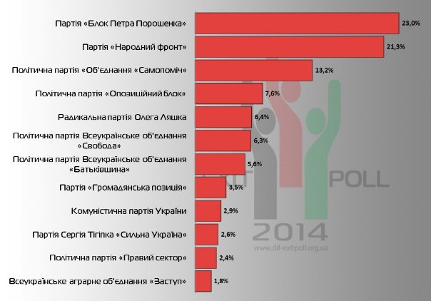 За даними Національного екзит-полу Рада-2014 щодо результатів голосування виборців України 26 жовтня, найбільше голосів набрав "Блок Петра Порошенка" з 23%.