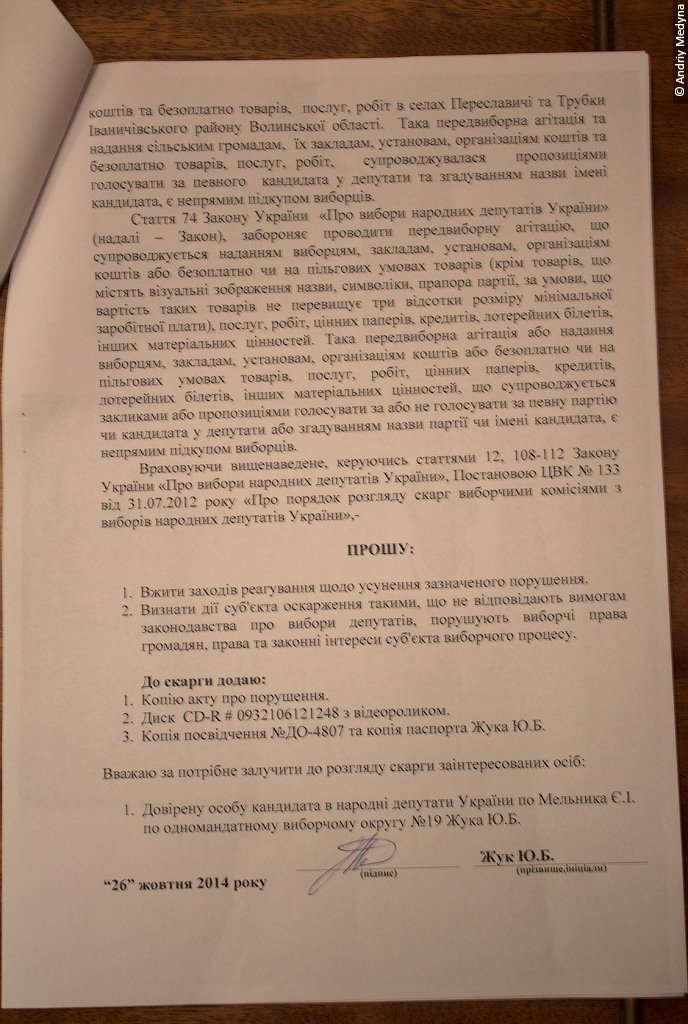 В окружну виборчу комісію № 19 26 жовтня надіслав скаргу Юрій Жук, який є довіреною особою кандидата в народні депутати від ВО «Свобода» Євгена Мельника, - повідомляє ОПОРА.