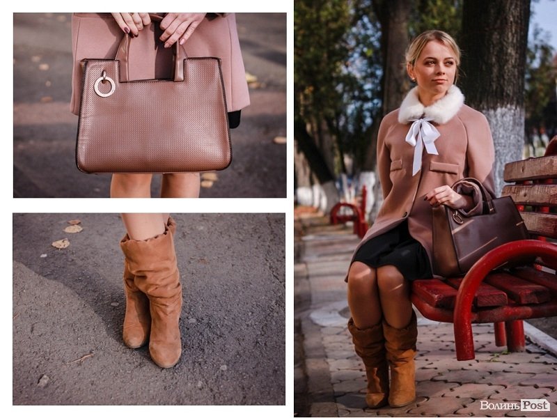 На фото дівчина одягнена у пальто, сукню, чоботи. Образ доповнюють сережки, перстні та сумка.