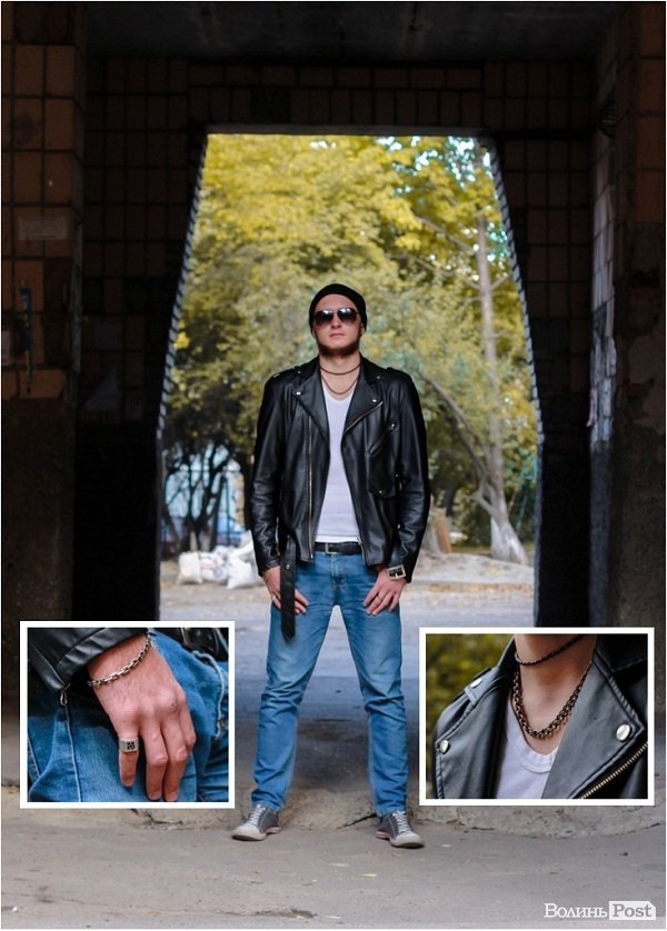 На фото наш герой одягнений у куртку-косуху, майку ATLANTIC, джинси, кеди. Образ доповнюють шапка SAVAGE, окуляри, ремінь, браслет, перстень, ланцюжок.