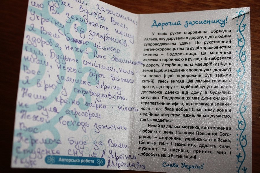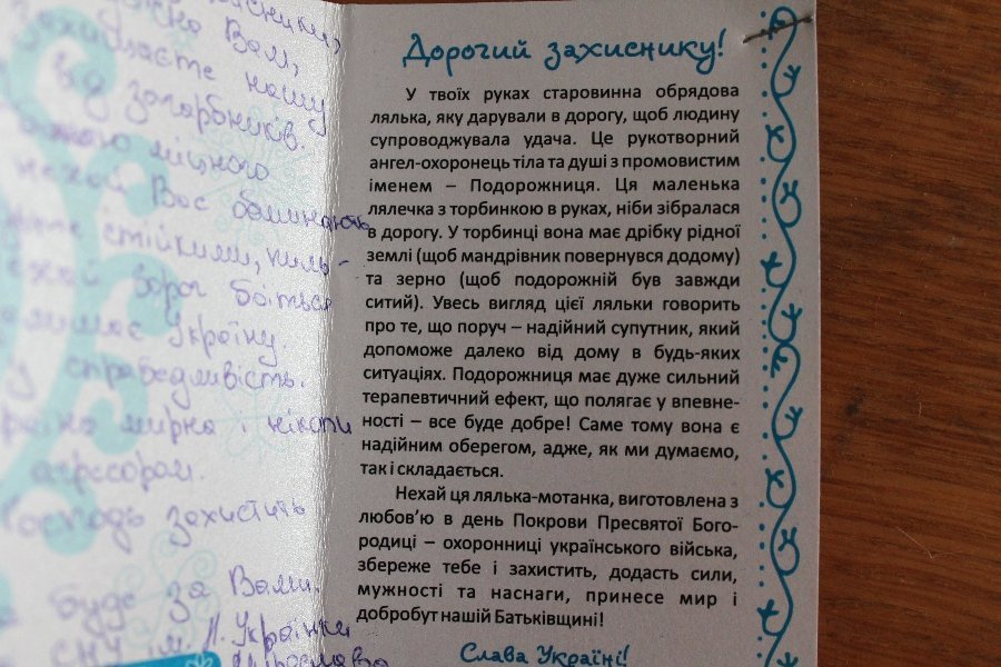 Окрім цього, в листівці написали загальне побажання для усіх вояків: «У твоїх руках старовинна обрядова лялька, яку дарували в дорогу, щоб людину супроводжувала удача. Це рукотворний ангел-охоронець тіла та душі з промовистим іменем – Подорожниця. Ця маленька лялечка з торбинкою в руках, ніби зібралася в дорогу. У торбинці вона має дрібку рідної землі (щоб подорожній був завжди ситий)».