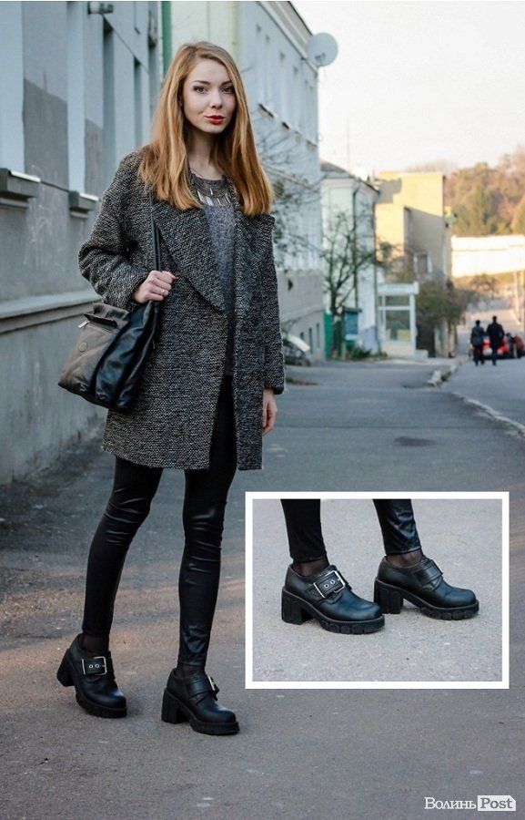 Лосини гарно дивляться із кофтою, яку підкреслює металеве кольє. За допомогою аксесуару кофта виглядає нестандартно. Окрім того до образу підходить взуття. Звісно, для декого воно дивне через свою масивність, але воно зараз у моді. Також ця тенденція масивного взуття простежується в колекціях багатьох світових кутюр’є.