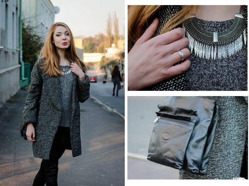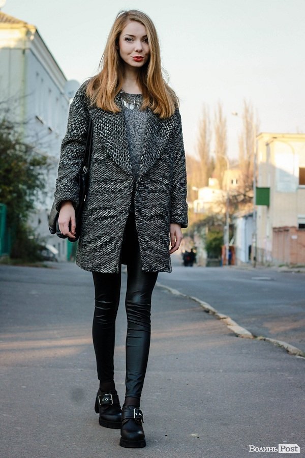 На фото дівчина одягнена у пальто CLOCKHOUSE, кофту ATMOSPHERE, лосини ZARA, ботинки RIVER ISLAND. Образ доповнює кольє та сумка.