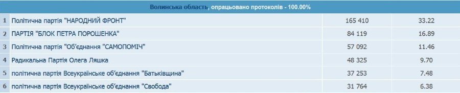 Найбільшу підтримку волинян здобула партія «Народний фронт», за яку проголосувало 33,22% виборців. Вдвічі менший результат отримала партія «Блок Петра Порошенка» - 16,89%.