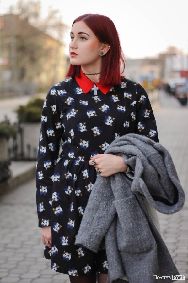 У героїні цікава сукня з живописним «котячим» принтом. Цей малюнок не є акцентом, тому органічно виглядає в загальній картинці, також його цікаво розглядати зблизька. А от яскравий червоний комірець сукні слугує акцентом.