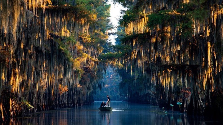 Дві людини пробираються крізь коридор з кипарисів на світанку на озері Каддо неподалік від кордонів Техасу і Луїзіани, США. (Фото: Майкл Хенсон)