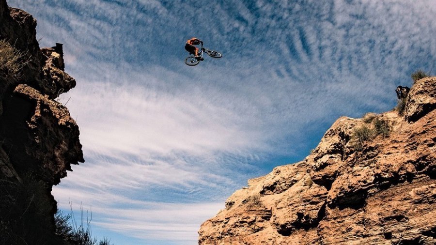 Брендан Фейрклу перестрибує через десятиметровий каньйон на чемпіонаті з маунтін-байку «Red Bull Rampage» в штаті Юта, США. (Фото: Періс Гор)