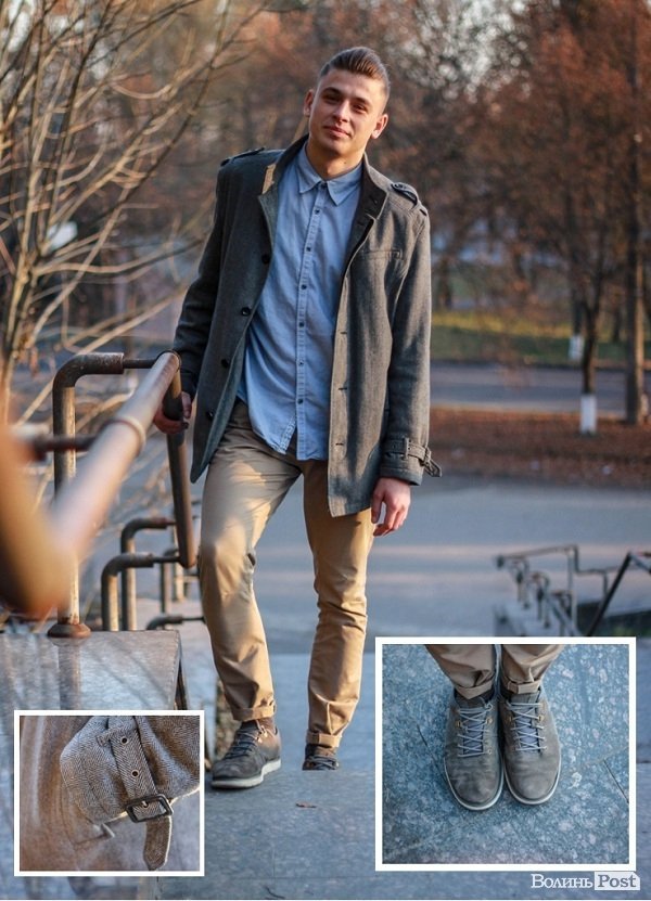 Сьогоднішній герой продумав свій образ. Модне, стильне і гарне пальто – так воно виглядає за допомогою декоративних елементів та фактурною тканиною «ялинка». З ним добре дивляться по молодіжному підгорнуті штани. До тканини пальта пасує взуття.