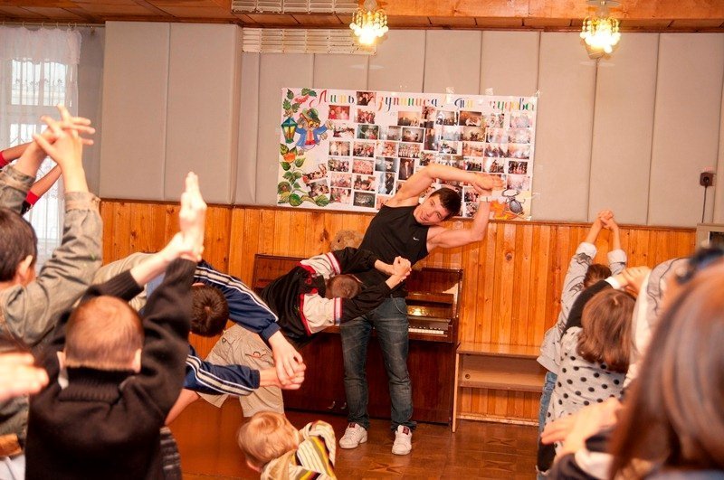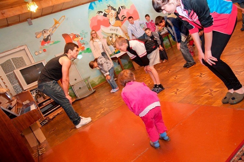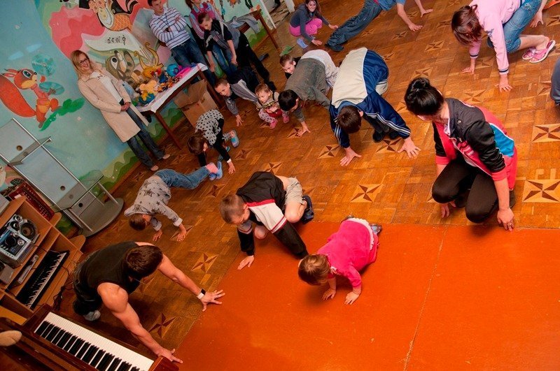 Тренери міжнародної мережі фітнес клубів «Joy Fitness» провели для дітей заняття з фізкультури, а також вчили хлопців бойовому мистецтву, а дівчат - танцювати ча-ча-ча.