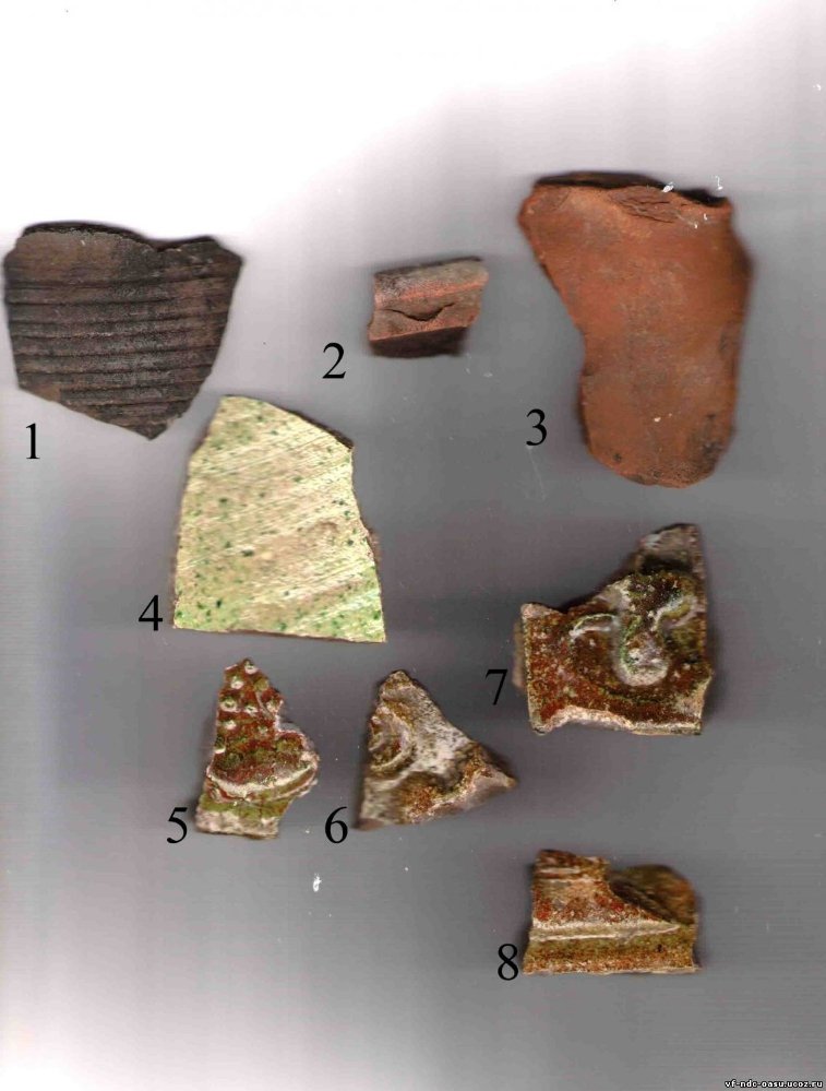 Один із фрагментів денця горщика мав клеймо, від якого збереглося лише частина кола. Тісто середньої якості, з домішками кварцового піску, двоколірне на зламі. Кераміка XV ст. представлена горщиками, вінця яких орнаментовані пальцевими вдавленнями – характерними для цієї епохи.