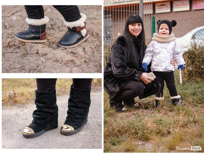 Також привертає увагу взуття мами. Воно робить ногу трішки грубуватою, але тим самим візуально видовжує ногу. Таке взуття ось уже два роки в fashion-моді. Аби образ мами був яскравішим та свіжішим, варто було б обрати золотистий шарф, рукавички чи замінити сумку. Адже все чорне і хотілося б якось освіжити образ за допомогою кольору.