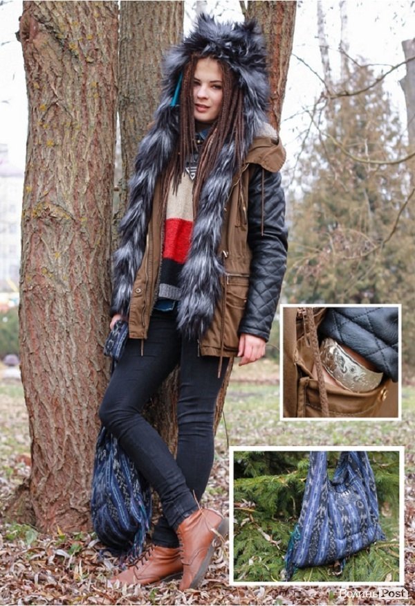 Із зовнішнього вигляду одразу ж видно, що сьогоднішня героїня вельми цікава та непересічна особистість. Свою неординарність дівчина підкреслює творчими прикрасами. Так, вона до намиста та кулонів підібрала яскраву сумку, їх носять здебільшого художники.
