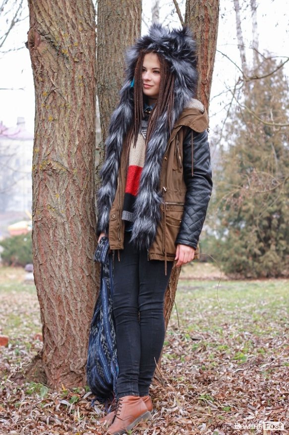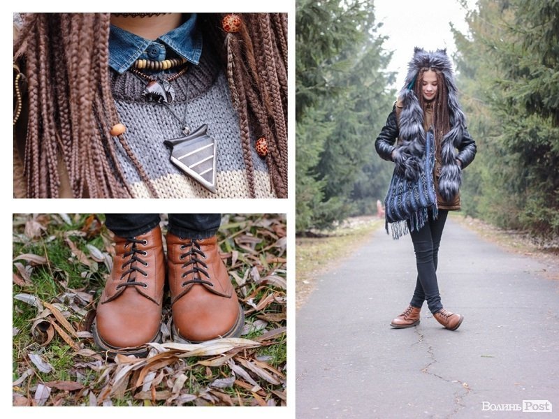 На фото наша героїня одягнена у сорочку Levis, кофту New Look, джинси та черевики. Образ прикрашає сумка, підвіски, браслет та чудернацька шапка, яку Віті подарував тато. Каже, ця шапка ручної роботи від дівчинки, яка відкрила свій інтернет-магазинчик та шиє такі шапочки.