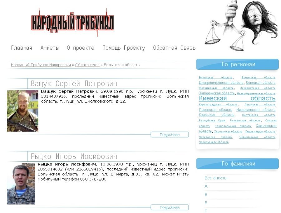 На ньому викладають досьє на проукраїнських активістів та учасників АТО. Особливу увагу приділяють бійцям добровольчих підрозділів української армії та міліції, - пише «Вісник і К».