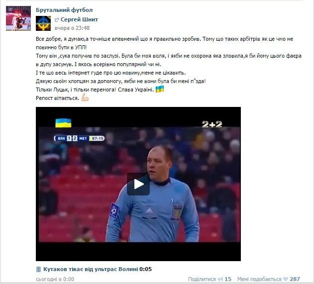 «Все добре, я думаю, а точніше впевнений, що я правильно зробив. Тому що таких арбітрів, як це ч..о, не повинно бути в УПЛ! Тому він отримав по заслузі. Була би моя воля, і якби не охорона, яка зловила, я би йому цього файера в д..у засунув. І якось всерівно, популярний чи ні. І те, що весь інтернет гуде про цю новину, мене не цікавить.
