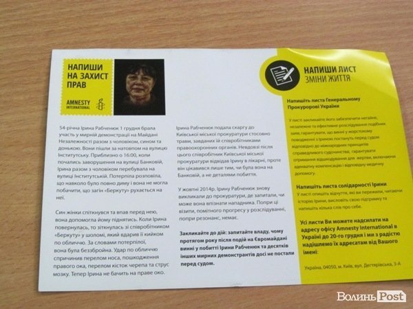 «Ірина була побита «Беркутом» 1 грудня 2013 року під час мирної демонстрації на Майдані Незалежності. Тепер вона не бачить на праве око. Український кінорежисер, майданівець та учасник мирних акцій протесту проти російської окупації Криму Олег Сенцов разом з Олександром Кольченком, Геннадієм Афанасьєвим та Олексієм Чирнієм були затримані Федеральною Службою Безпеки РФ у Севастополі та вивезені до Москви. Там вони перебувають під вартою й досі – їх звинувачують у тероризмі»,- розповіла координатор благодійних програм ГО «Фундація розвитку громад» Любов Казмірчук.