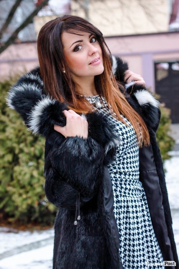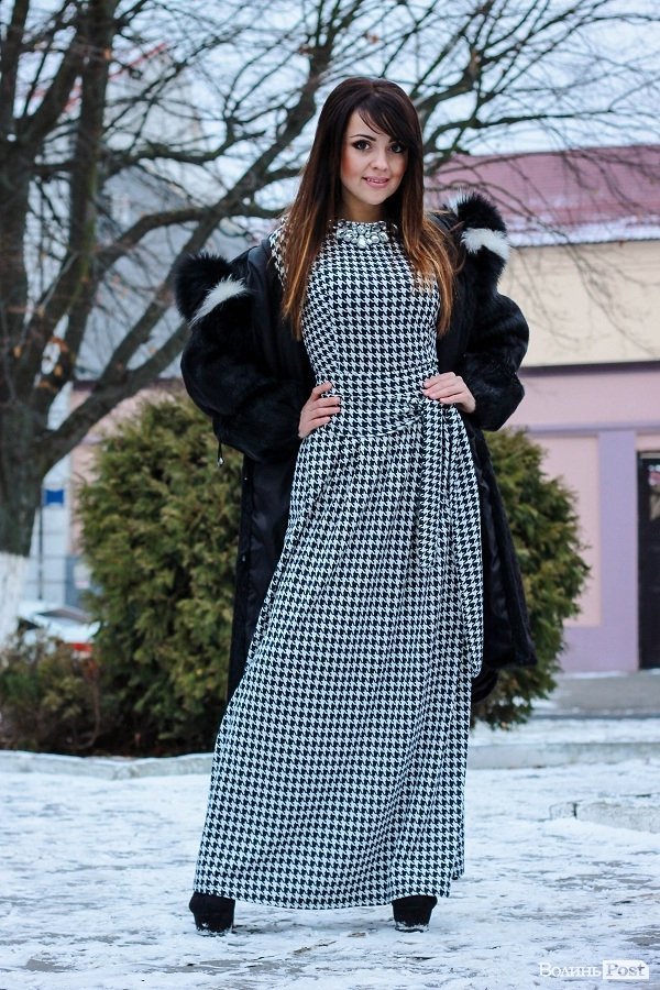 На фото Іванна одягнена у шубку, сукню, чобітки. Образ прикрашає кольє. На жаль, марок одягу та прикраси дівчина не згадала.