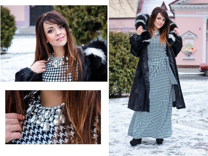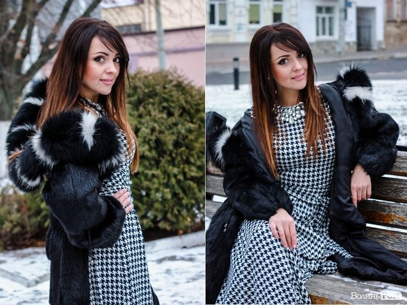 Шубка цікава своїми чорно-білими смужками, що вдало компонується із сукнею. Щодо взуття: хоча воно і на високій платформі, проте не виглядає громіздким – навпаки зорово видовжує ноги.