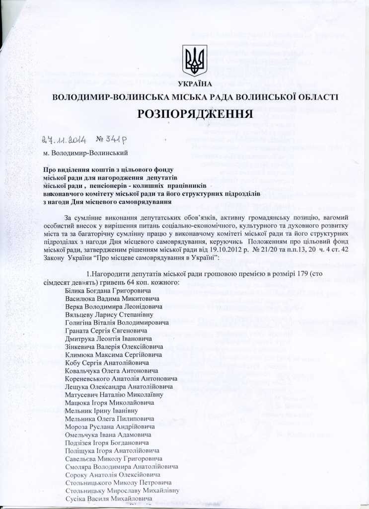 За розпорядженням Володимир-Волинської міської ради та за підписом міського голови Петра Саганюка, з нагоди Дня місцевого самоврядування були нагородження депутати місцевої ради грошовою премією.