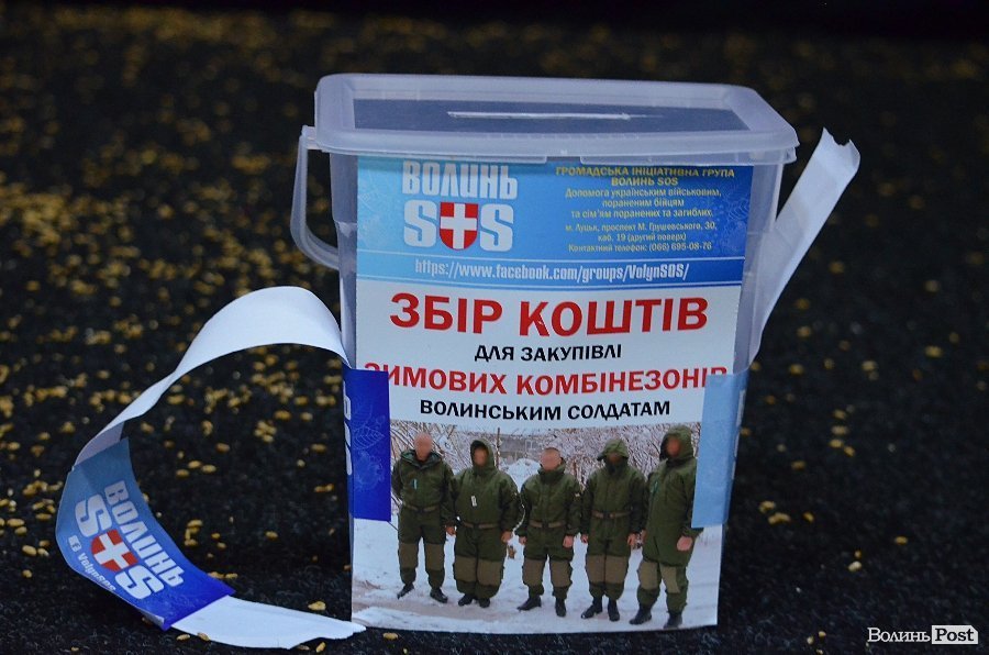 Також перед входом на виставу та під час самого заходу відбувався збір коштів для пошиття термокомбінезонів волинським бійцям та у фонд загиблого героя Віктора Гурняка.