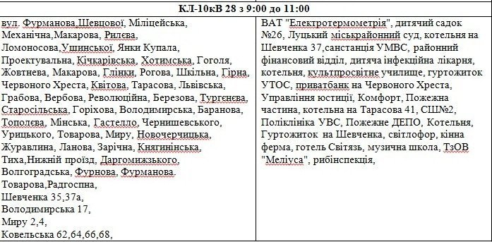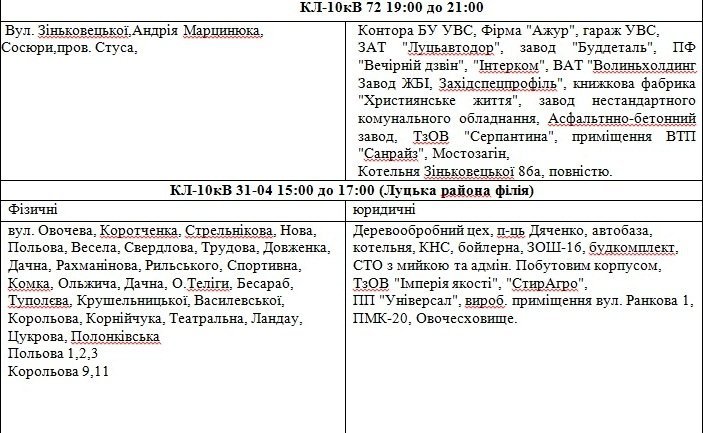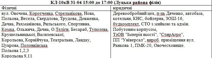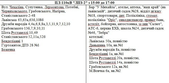 Так, без електроенергії можуть залишитися житлові будинки, підприємства та організації на вулицях: