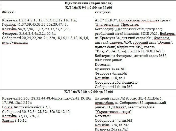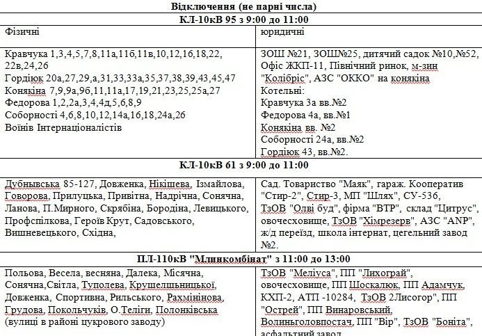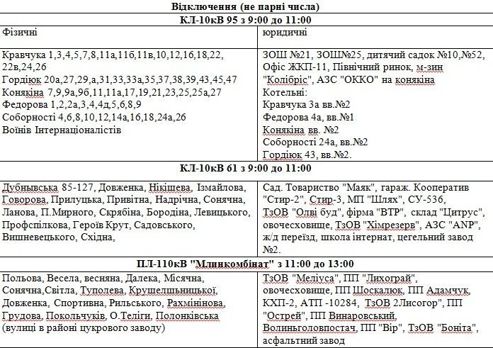 Луцька міська філія ПАТ «Волиньобленерго» надала інформацію про адреси споживачів, у яких буде припинено електропостачання в разі застосування графіків аварійних вимкнень на території міста Луцька.