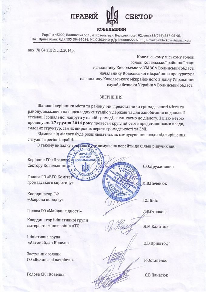 Під час народного віча на площі Героїв Майдану ковельський "Правий сектор" та інші організації ухвалили спільне звернення-ультиматум до органів влади міста та району.