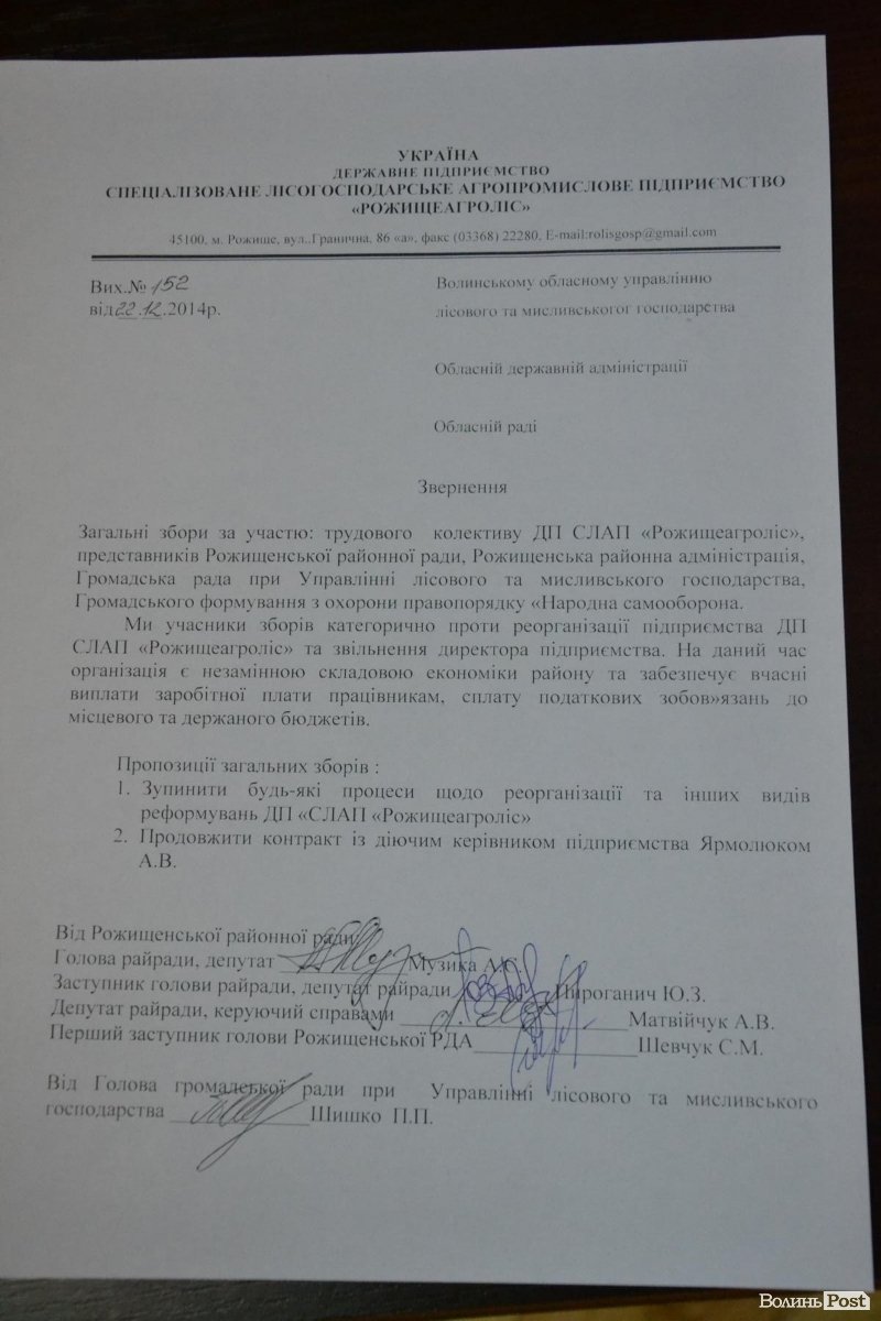 «Ми, учасники зборів категорично проти реорганізації підприємства ДП СЛАП «Рожищеагроліс» та звільнення директора підприємства. На даний час організація є незмінною складовою економіки району та забезпечує вчасні виплати заробітної плати працівникам, сплати податкових зобовязань до місцевого та державного бюджету», - йдеться у зверненні.