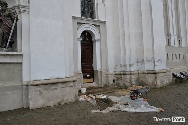 У костелі святих Петра і Павла у Луцьку - заміна: поставили нові двері, натомість старі зняли, щоб віддати у музей.