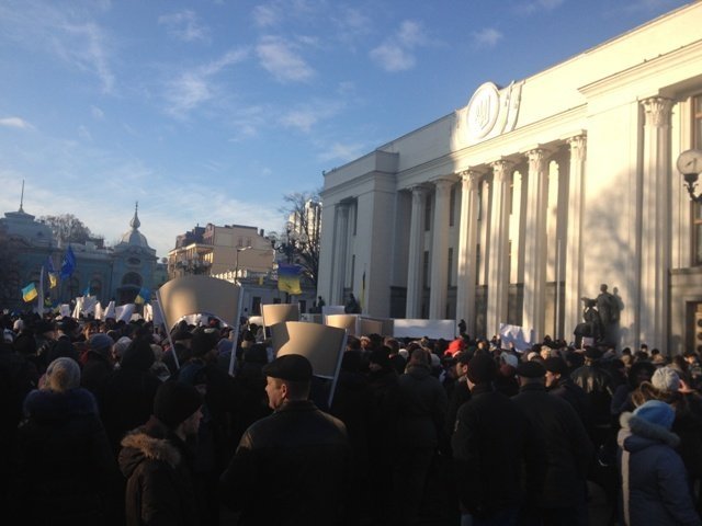 Біля будівлі Верховної Ради зібралося науковці, вкладники, кредитори та представники букмекерського бізнесу України, щоб озвучити свої вимоги до влади.