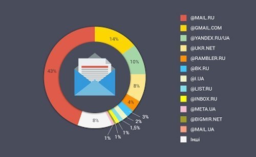 Понад 64% усіх e-mail українців припадає на російські поштові сервіси. Українськими компаніями електронної пошти користуються 14% жителів України та приблизно стільки ж загальновизнаним у світі Gmail.