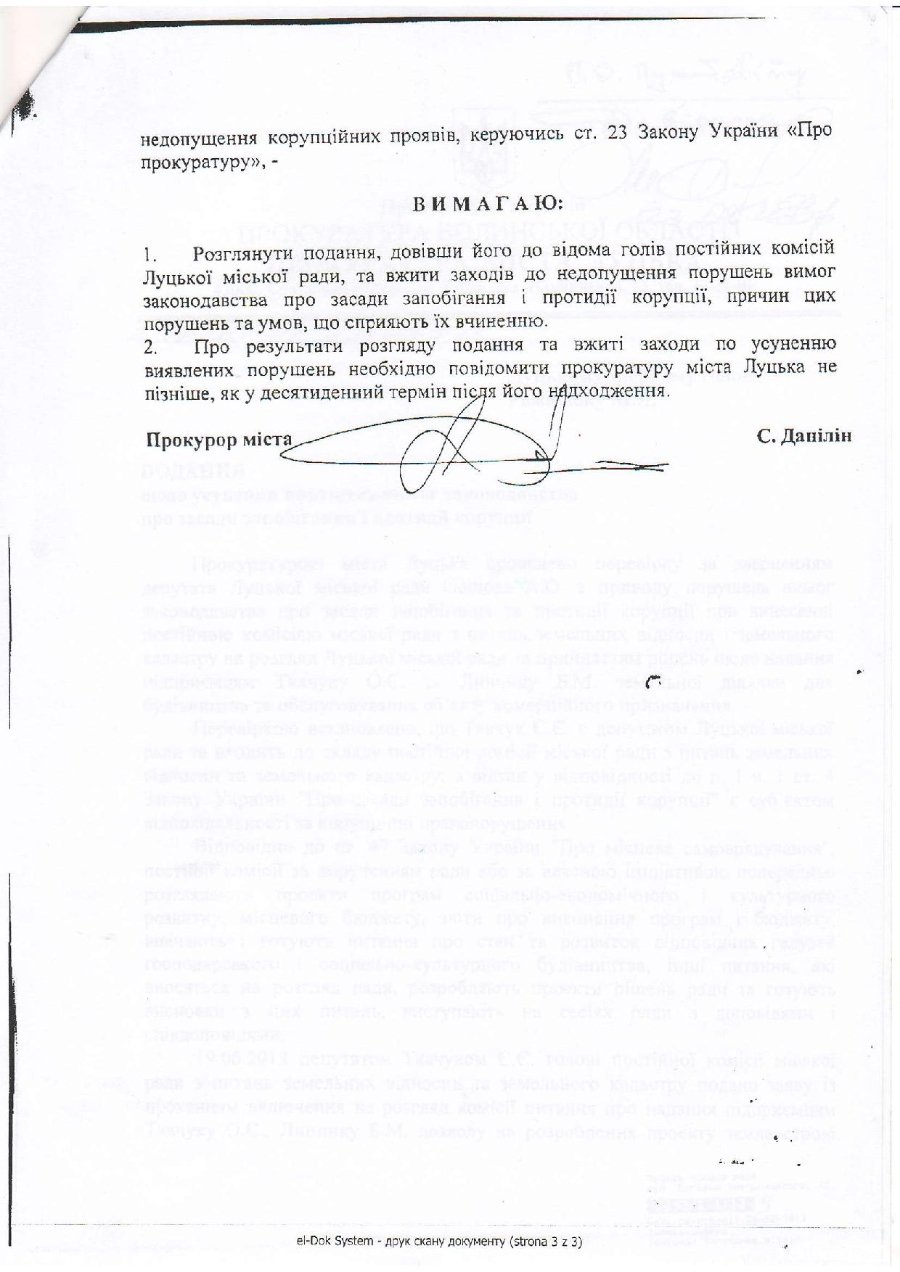 Депутат посилається на Господарського суду Волинської області від 8 квітня 2013 року та рішення Рівненського апеляційного господарського суду від 28 травня 2013 про відхилення позову та апеляційної скарги прокурора міста на рішення міськради щодо виділення двох земельних ділянок Олександру Ткачуку і Богдану Линнику.