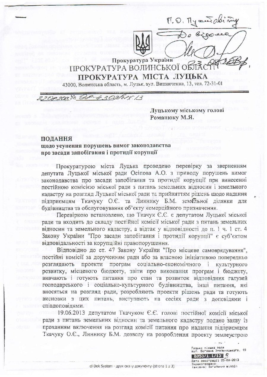 У поданні щодо усунення порушень вимог законодавства про засади запобігання і протидії корупції, яке 22 жовтня 2013 року спрямував до міського голови Миколи Романюка прокурор Сергій Данілін, йдеться: «У ході перевірки встановлено, що підприємець Ткачук О.Є. є сином члена постійної комісії міської ради з питань земельних відносин та земельного кадастру Ткачука Є.Є».