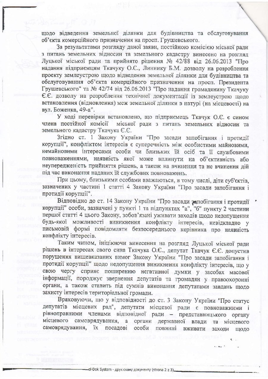 За результатами перевірки встановили, що 19 червня 2013 року «депутатом Ткачуком Є.Є, голові постійної комісії міської ради з питань земельних відносин та земельного кадастру подано заяву із проханням включення на розгляд комісії питання про надання підприємцям Ткачуку О.Є., Линнику Б.М. дозволу на розроблення проекту землеустрою щодо відведення земельної ділянки для будівництва та обслуговування об’єкта комерційного призначення на просп. Грушевського».