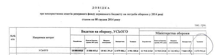 “У Міноборони заявляють, що використовували мало не 98% коштів, виділених у 2014 році на армію. Але от дивна річ: у грудні Комітету ВР з питань нацбезпеки і оборони була надана офіційна довідка, в якій чорним по білому зазначено: на 8 грудня 2014 року залишок не використаних коштів, на які було відкрито асигнування з резервного фонду держбюджету для МО, становив 3 млрд 273 млн 912 тис грн”, - зазначив депутат.