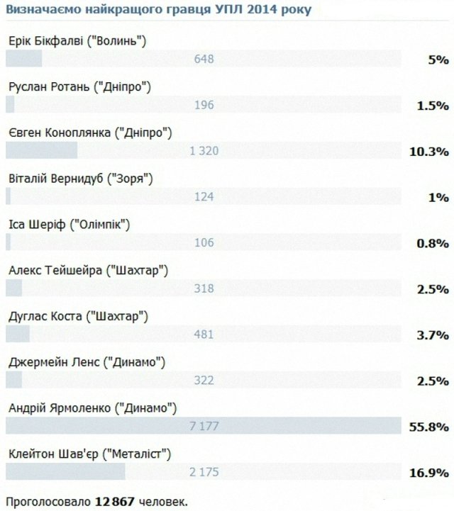 За результатами голосування першим, із великим відривом став вінгер "Динамо" Андрій Ярмоленко, за якого віддали свої голоси більше 7 тисяч читачів (55,8 %).