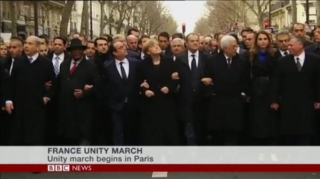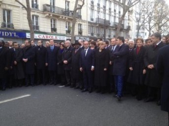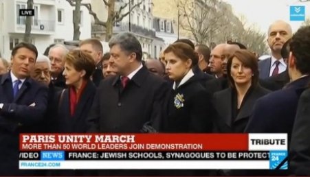 У Парижі лідери світових держав розпочали Марш єдності. Очолюють колону світових політиків Ангела Меркель, Франсуа Олланд та прем'єр Італії Маттео Ренці. Поруч із ними - президент України Петро Порошенко.