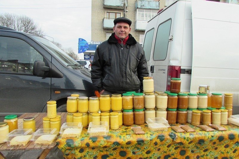 Бджоляр з Кіровограда Олександр Соломоненко привіз на ярмарок близько десяти видів меду, квітковий пилок, віск та прополіс.