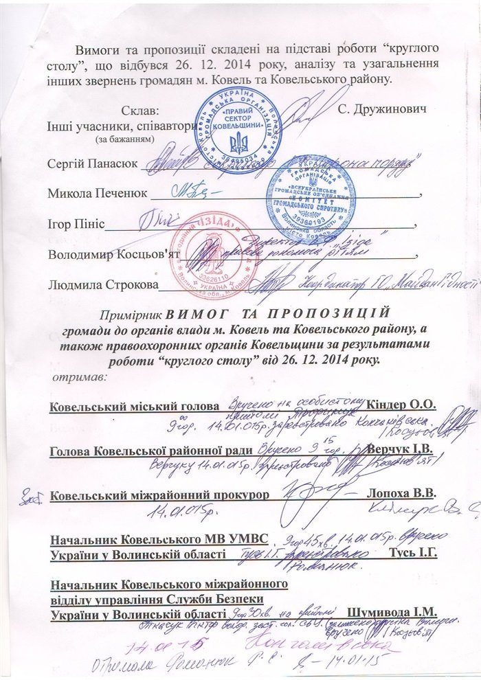Громадськість міста Ковеля звернулася до органів влади міста Ковеля, Ковельського району та правоохоронних органів Ковельщини з вимогою до 20 січня 2015 року визначитися із особами, які відповідатимуть за реалізацію передбачених ініціатив, а також, які візьмуть обов’язкову участь у круглому столі, що відбудеться 20 січня, о 15:00, в КП «Ковельський міський культурно-просвітницький центр» (місто Ковель, вулиця Незалежності, 89).